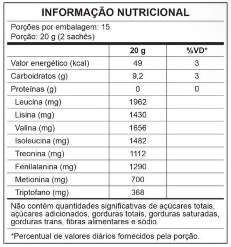 Ingredientes: L-Leucina, L-Valina, L-Isoleucina, cloridrato de L-lisina, L-Fenilalanina, L-Treonina, L-Metionina, L-Triptofano, edulcorantes isomaltulose e glicosídeo esteviol de Stevia rebaudiana Bertoni, acidulante ácido cítrico, aroma idêntico ao natural de limão, espessante goma xantana, antiumectante dióxido de silício e corante clorofilas.