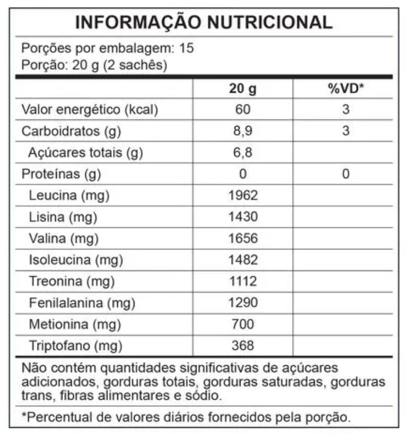 Ingredientes: L-Leucina, L-Valina, L-Isoleucina, cloridrato de L-lisina, L-Fenilalanina, L-Treonina, L-Metionina, L-Triptofano, edulcorantes isomaltulose e glicosídeo esteviol de Stevia rebaudiana Bertoni, acidulante ácido cítrico, aroma idêntico ao natural de tangerina, espessante goma xantana, corante extrato de urucum, base norbixina e antiumectante dióxido de silício.