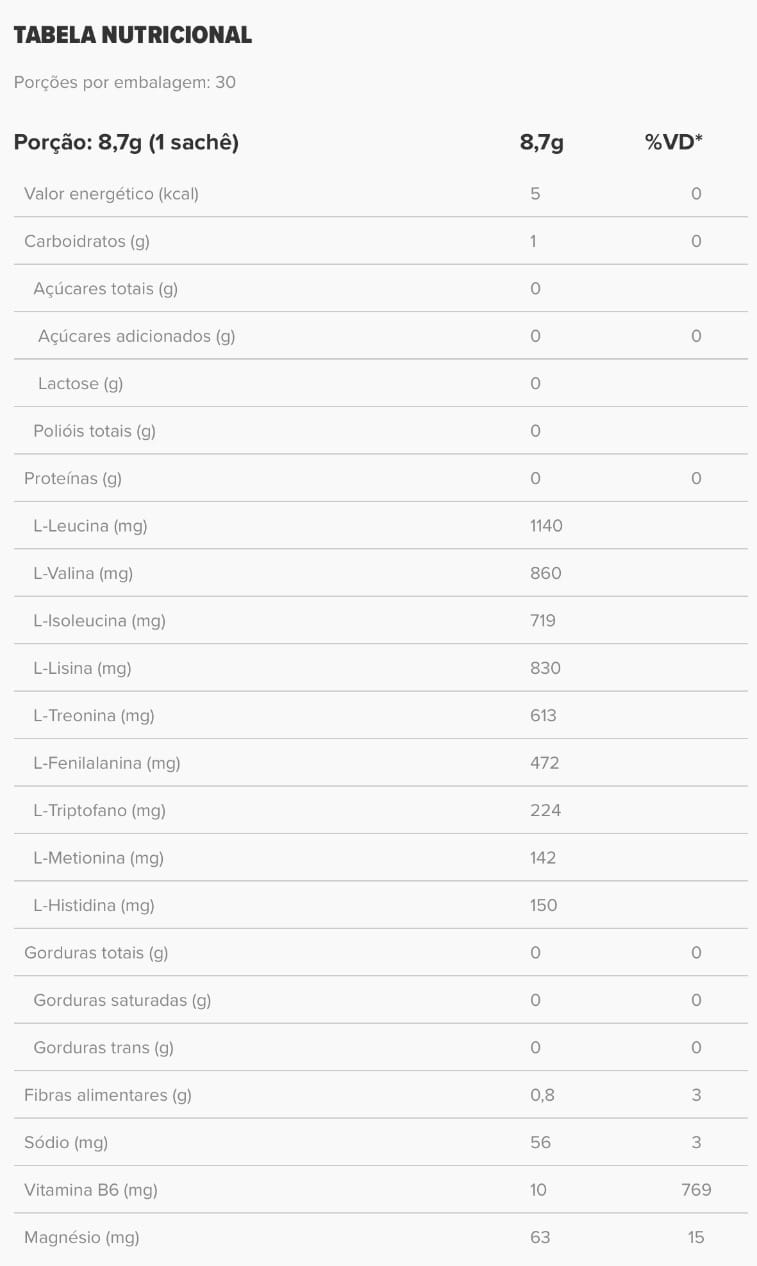Ingredientes: Blend de aminoácidos essenciais (L-leucina, cloridrato de L-lisina, L-valina, L-isoleucina, L-treonina, L- fenilalanina, L-triptofano, L-histidina e L-metionina), goma acácia, citrato de magnésio, alfafa germinada, cevada germinada, couve, trigo germinado (sem glúten), aveia germinada, piridoxal-5-fosfato, aromas naturais, antiumectante dióxido de silício, antioxidante ácido cítrico, edulcorante glicosídeos de esteviol (estévia).