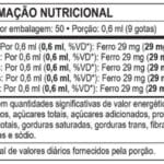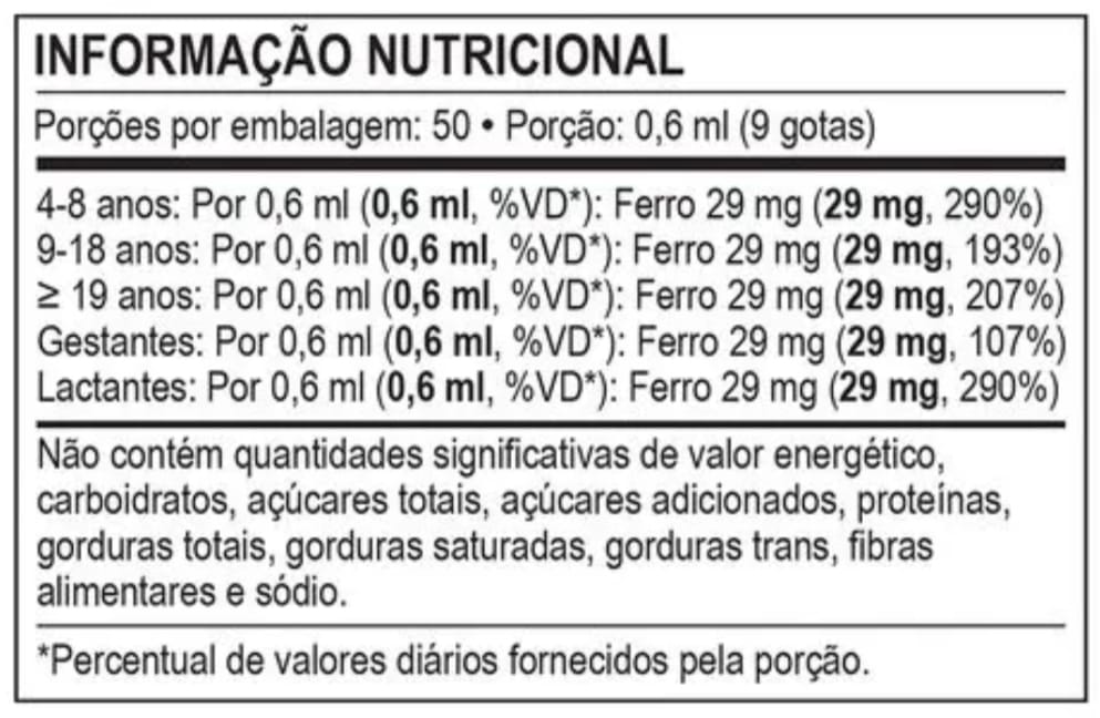 Ingredientes: Água, bisglicinato ferroso, agente de massa glicerol, emulsificante alginato de sódio, regulador de acidez lactato de cálcio e conservantes sorbato de potássio e benzoato de sódio.