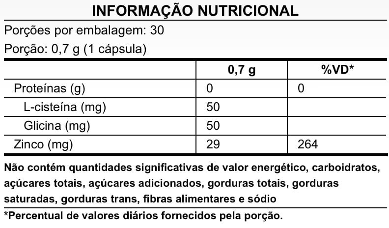Ingredientes: Cápsula (água purificada, gelificante gelatina, umectante glicerol e corantesais de potássio e sódio de clorofilina cúprica), óleo de girassol, bisglicinatode zinco, óleo de coco, L-cisteína, glicina, emulsificante lecitina eestabilizante cera de abelha.