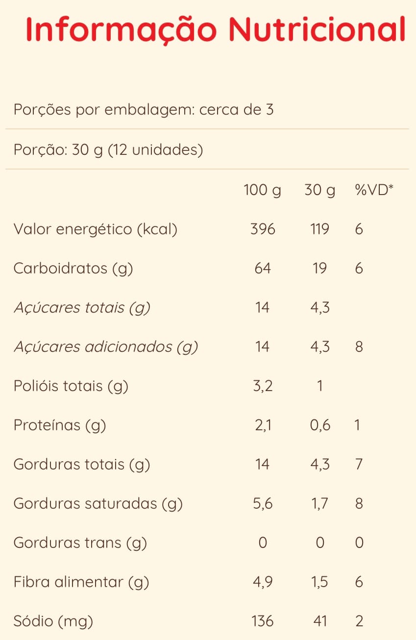Ingredientes: Amido de milho, farinha de arroz, açúcar demerara, gordura de palma, leite de coco, óleo de girassol, adoçante maltitol, fécula de batata, coco ralado, fibra de inulina e acácia, emulsificantes: lecitina de soja, goma xantana, mono e diglicerídeos de ácidos graxos, manteiga de cacau, sal, agentes de crescimento: fermento químico, bicarbonato de amônio e bicarbonato de sódio, aromatizante sintético idêntico ao natural e antioxidante natural extrato de alecrim.
