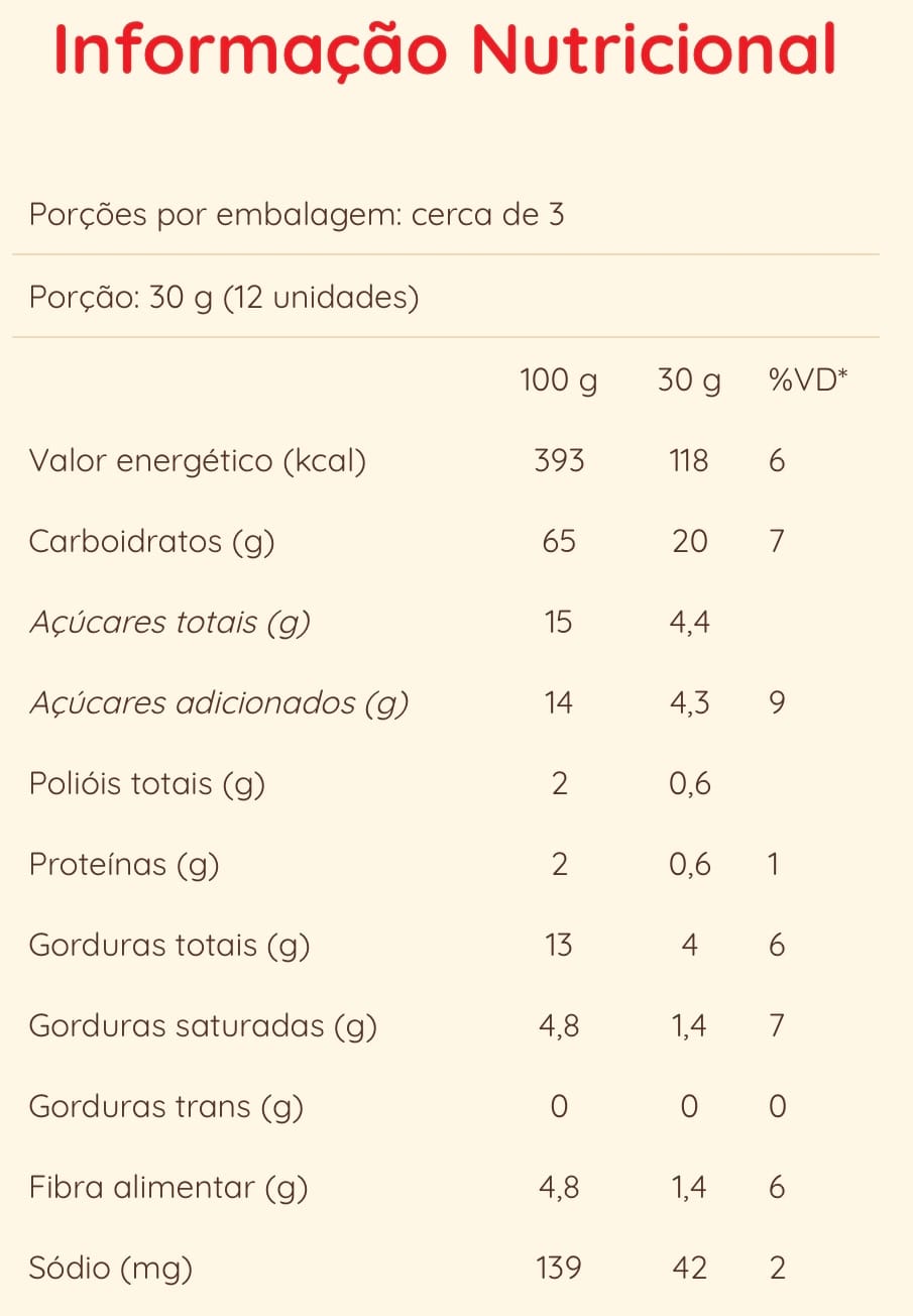 Ingredientes: Amido de milho, farinha de arroz, açúcar demerara, gordura de palma, leite de coco, óleo de girassol, adoçante maltitol, fécula de batata, fibra de acácia e inulina, emulsificantes: lecitina de soja, goma xantana, mono e diglicerídeos de ácidos graxos, manteiga de cacau, sal, agentes de crescimento: fermento químico, bicarbonato de amônio e bicarbonato de sódio, aromatizante sintético idêntico ao natural e antioxidante natural extrato de alecrim.