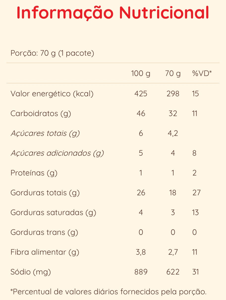 Ingredientes: Amido de milho modificado, farinha de milho, óleo de girassol, farinha de arroz, açúcar demerara, fibras (inulina e goma acácia), sal, páprica doce, açúcar refinado, emulsificantes (lecitina de soja, mono e diglicerídeos de ácidos graxos, goma xantana e ésteres de ácido tartárico diacetilado com mono e diglicerídeos), aromatizante sintético idêntico ao natural sabor páprica, antioxidante natural (extrato de alecrim), agentes de crescimento (fermento químico, bicarbonato de amônio e bicarbonato de sódio) e corante natural betacaroteno.
