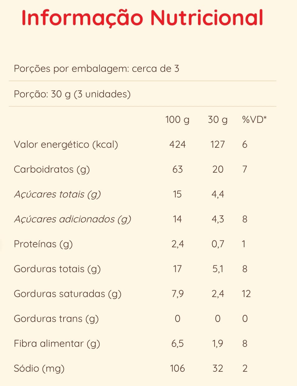 Ingredientes: Amido de milho, açúcar, farinha de arroz, gordura vegetal, leite de coco, edulcorante maltitol, fibras inulina e acácia, cacau alcalino, gema de ovo, manteiga de cacau, , leite de coco, edulcorante maltitol, fibras inulina e acácia, cacau alcalino, gema de ovo, manteiga de cacau, emulsificantes lecitina de soja, mono e diglicerídeos de ácidos graxos e goma xantana, sal, agentes de crescimento (bicarbonato de sódio, fermento químico e bicarbonato de amônio), antioxidante natural extrato de alecrim e aromatizantes sintéticos idênticos aos naturais sabor baunilha e cacau.