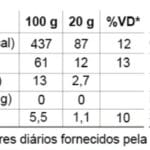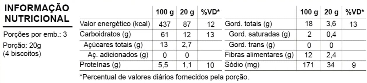 Ingredientes: Farinha de trigo enriquecida com ferro e ácido fólico, fécula de mandioca, óleo de girassol, suco de maçã, banana desidratada, fibra de chicória, fibra de aveia, cacau em pó e fermento químico bicarbonato de sódio.