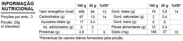 Ingredientes: Farinha de trigo enriquecida com ferro e ácido fólico, fécula de mandioca, óleo de girassol, suco de maçã, maçã desidratada, fibra de chicória, fibra de aveia, canela em pó e fermento químico bicarbonato de sódio.