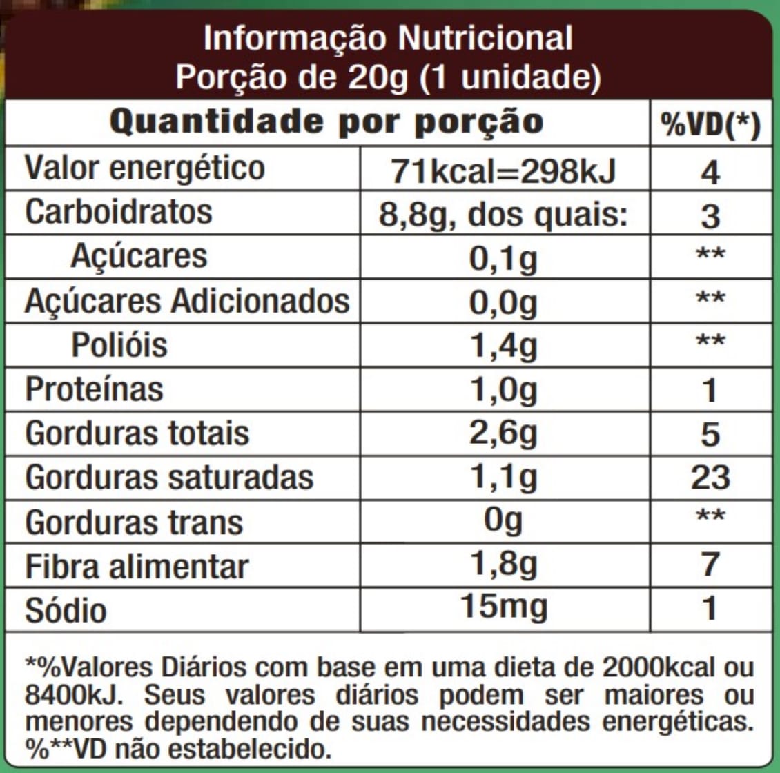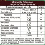 Ingredientes: Recheio caramelo (pasta de tâmara, pasta de castanha-de-caju, leite de coco em pó, xarope de tapioca, xarope de maltitol, cacau em pó, polidextrose, sal, emulsificante lecitina de girassol, aroma natural de caramelo e conservante sorbato de potássio), cobertura sabor chocolate zero adição de açúcar e cripie de arroz.