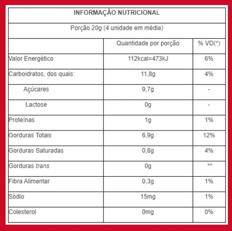 Ingredientes: Açúcar, massa de cacau, manteiga de cacau, emulsificante lecitina de girassol, polirricinoleato de poliglicerol e aroma natural de morango.