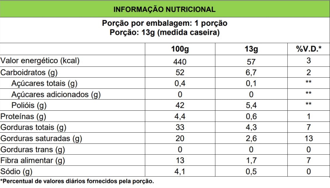 Ingredientes: Massa de cacau, manteiga de cacau, polidextrose, edulcorante maltitol,