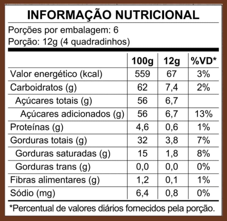 Ingredientes: Açúcar, massa de cacau, manteiga de cacau, emulsificante lecitina de girassol e polirricinoleato de poliglicerol.