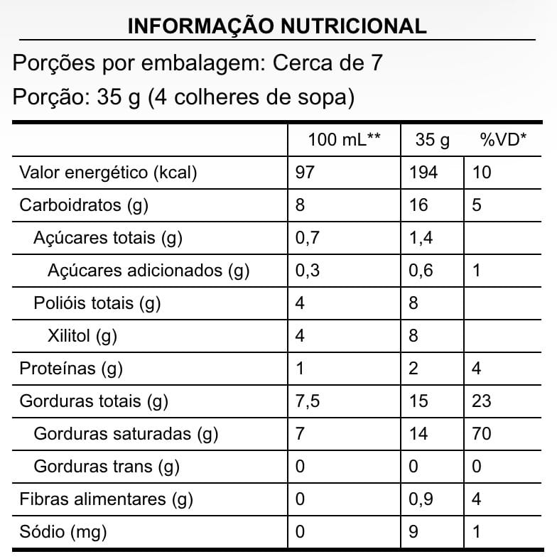 Ingredientes: Leite de coco em pó (leite de coco, maltodextrina de mandioca e emulsificante goma acácia), cacau em pó, café solúvel, canela em pó, edulcorantes xilitol e glicosídeos de esteviol de Stevia rebaudiana Bertoni, aromatizantes naturais e espessante goma guar.