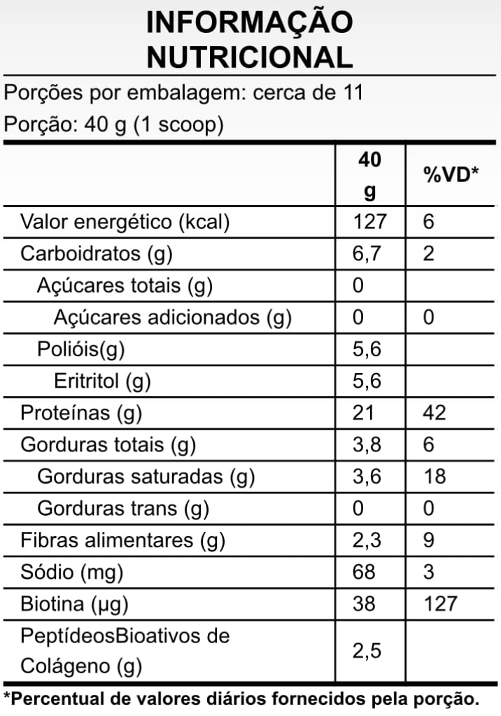 Ingredientes: Colágeno hidrolisado, leite de coco, peptídeosbioativos de colágeno hidrolisado com pesomolecular médio de 2KDA (Verisol®), d-biotina(vitamina B7), hortelã em pó (mentha piperita L.), edulcorantes: eritritol e taumatina, espessantes: goma guar e xantana, aroma natural, acidulanteácido cítrico e antiumectante dióxido de silício.