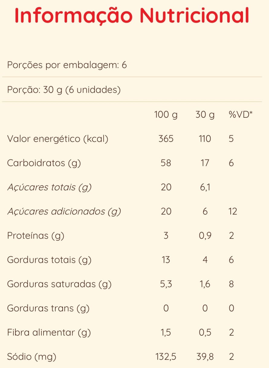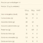 Ingredientes: Amido de milho, açúcar, óleo de girassol, gotas de chocolate meio amargo (açúcar, gordura vegetal, cacau em pó, emulsificante lecitina de soja e aromatizante), farinha de arroz, edulcorante maltitol, clara de ovo, gordura de palma, manteiga de cacau, gema de ovo, fermentos químicos (carbonato de cálcio, bicarbonato de amônio e bicarbonato de sódio), sal, emulsificantes (lecitina de soja, mono e diglicerídeos de ácidos graxos), espessante goma xantana e aromatizante sintético idêntico ao natural.
