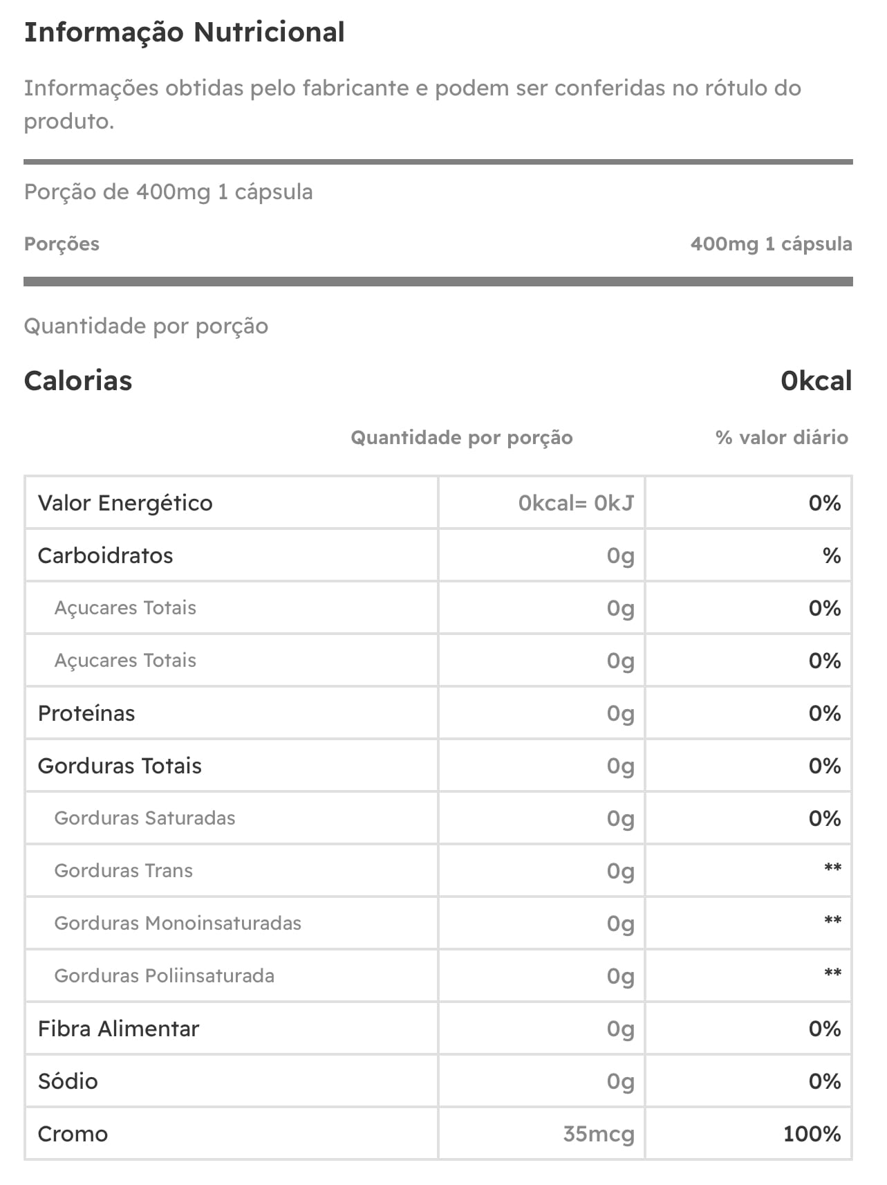 Ingredientes: Picolinato de cromo, antiumectantes (amido e dióxido de silício). Componentes da Cápsula: gelatina (gelificante), glicerina (umectante).