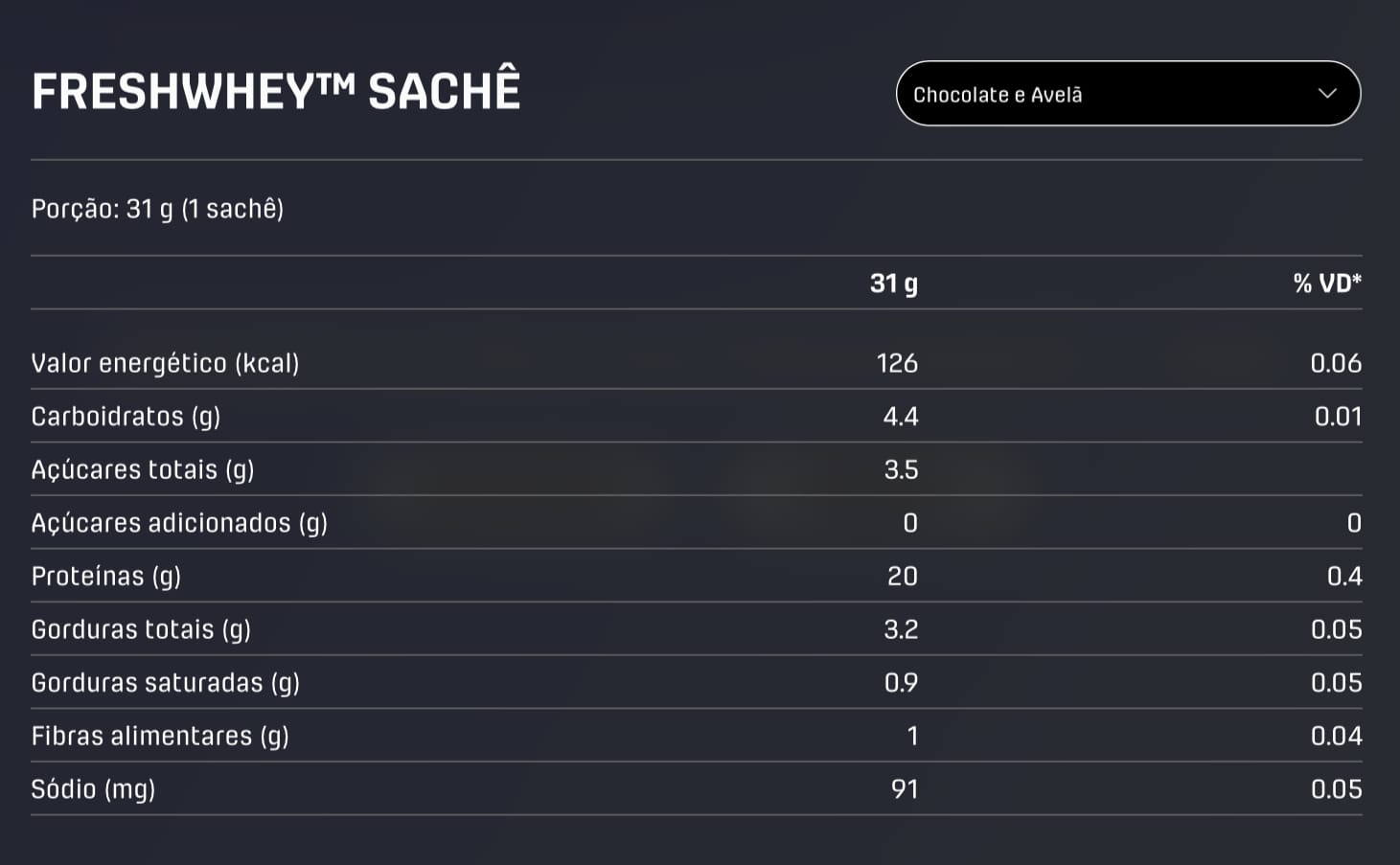 Ingredientes: Proteína de soro do leite concentrada, proteína de soro do leite isolada, pasta de avelã liofilizada, cacau solúvel, proteína de soro do leite hidrolisada, edulcorantes glicosídeos de esteviol de Stevia rebaudiana Bertoni e taumatina, e aromatizante natural.
