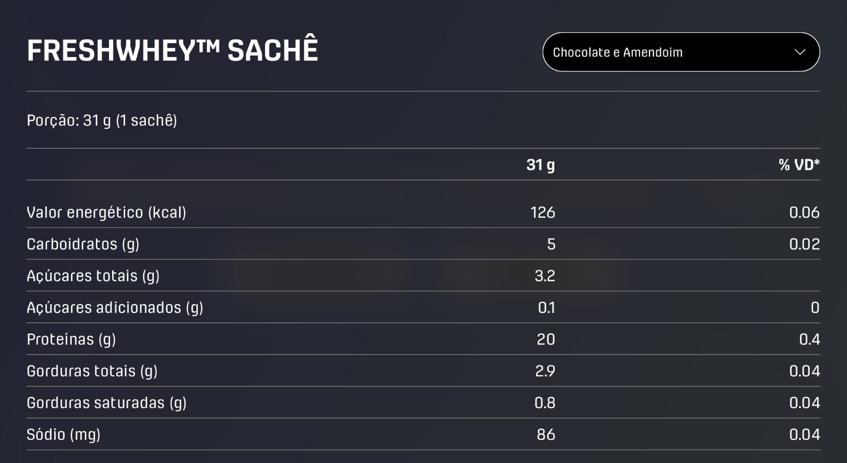 Ingredientes: Proteína de soro do leite concentrada, proteína de soro do leite isolada, pasta de amendoim liofilizada em pó, cacau solúvel, proteína de soro do leite hidrolisada, aromatizante natural e edulcorantes glicosídeos de esteviol de Stevia rebaudiana Bertoni e taumatina.