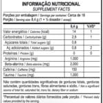 Ingredientes: Beta-alanina, L-arginina, taurina,isomaltulose, cafeína, aromatizantes, acidulante ácido cítrico, regulador de acidez ácido málico,edulcorante sucralose, antiumectante estearato de magnésio e corantes artificiais amarelo tartrazina (INS 102) e azul brilhante fcf.