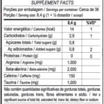 Ingredientes: Beta-alanina, L-arginina, taurina,isomaltulose, cafeína, aromatizantes, acidulante ácido cítrico, regulador de acidez ácido málico,edulcorante sucralose, antiumectante estearato de magnésio e corantes artificiais amarelo tartrazina (INS 102) e azul brilhante fcf.