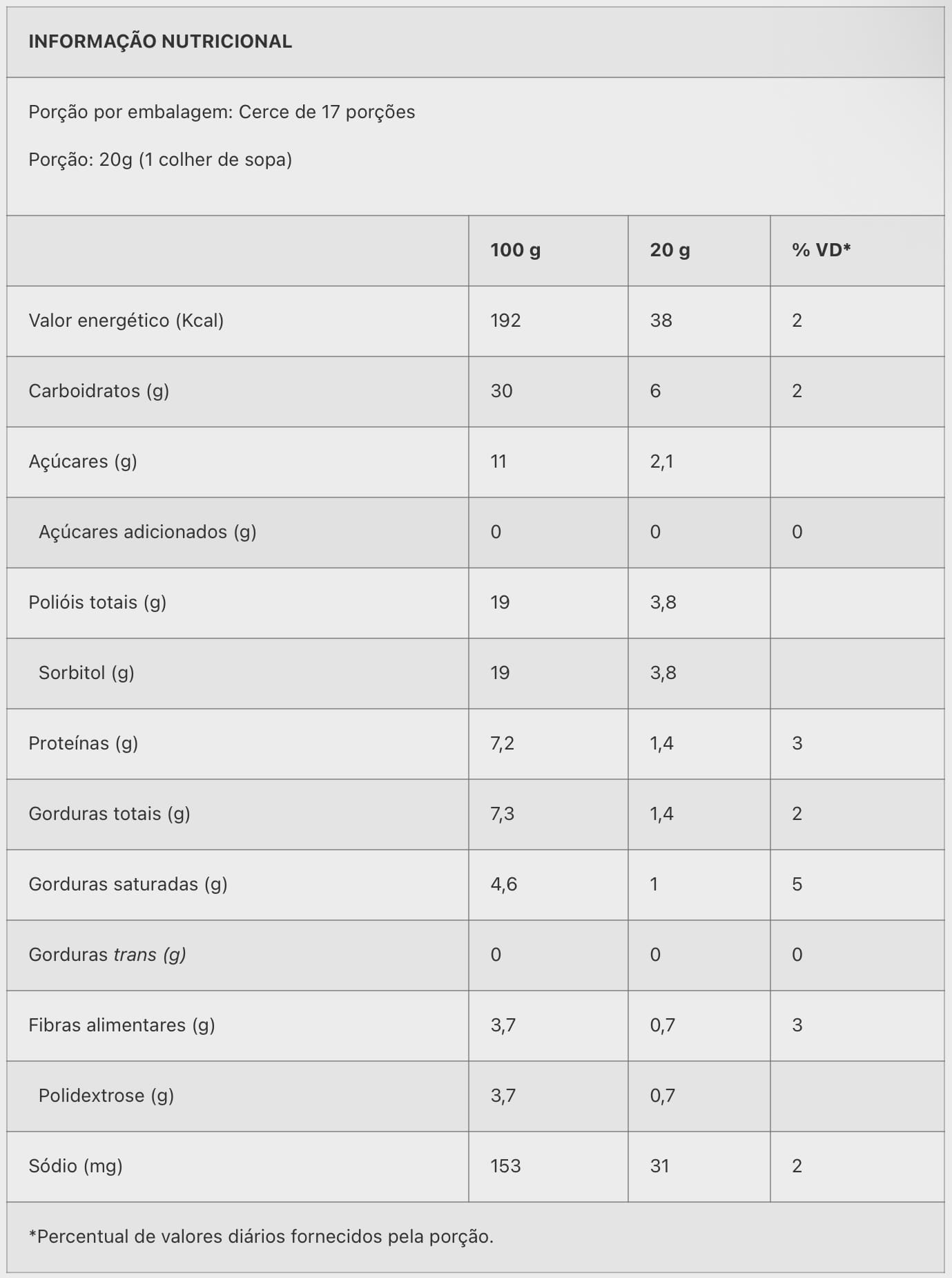 Ingredientes: Leite em Pó Integral e/ ou Leite Integral; Edulcorantes: Sorbitol, Sucralose; Espessante: Polidextrose; Estabilizantes: Pectina Cítrica, Citrato de Sódio; Regulador de Acidez: Bicarbonato de Sódio; Conservador: Sorbato de Potássio; Aromatizante: Aroma Sintético Idêntico ao Natural de Leite Condensado.