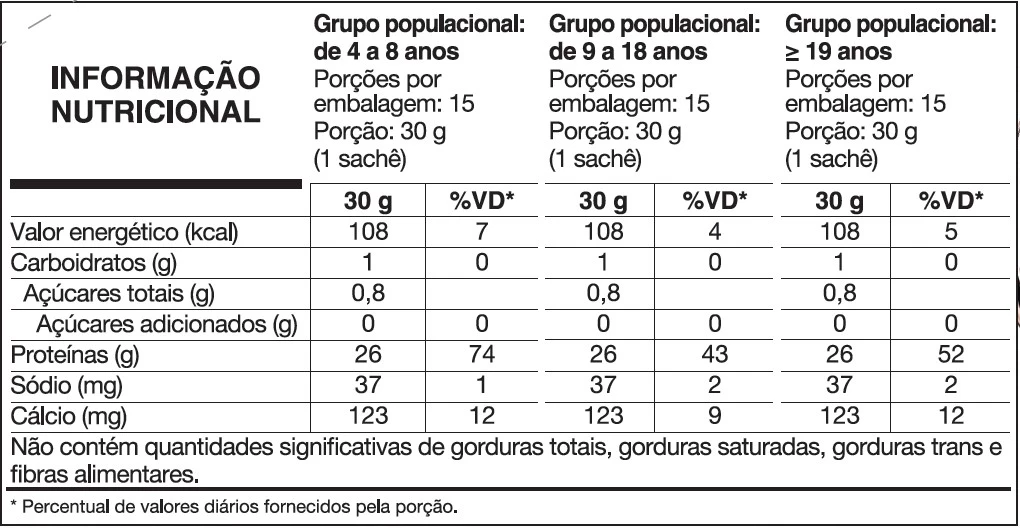 Ingredientes: Proteína de soro do leite Isolada (Whey Protein Isolate – WPI), cacau em pó, aroma idêntico ao natural, edulcorantes glicosídeos de esteviol (estévia) e taumatina e espessante goma xantana.