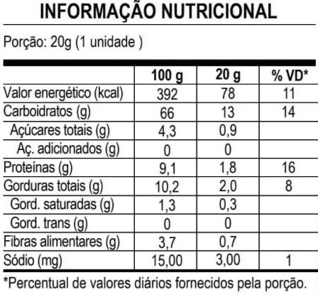 Ingredientes: Farinha de arroz*, farinha de amaranto*, tomate em pó, óleo de girassol, farinha de batata doce e manjericão em pó.