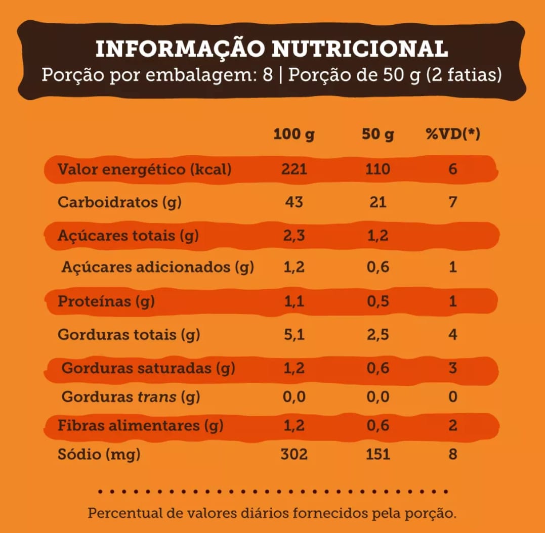 Ingredientes: Amido de milho, amido modificado de mandioca, óleo vegetal, farinha de mandioquinha, farinha de cenoura, açúcar, gema, sal, conservadores propionato de cálcio e ácido sórbico, estabilizantes hidroxipropilmetilcelulose e goma xantana, emulsificante mono e diglicerídeo de ácidos graxos.