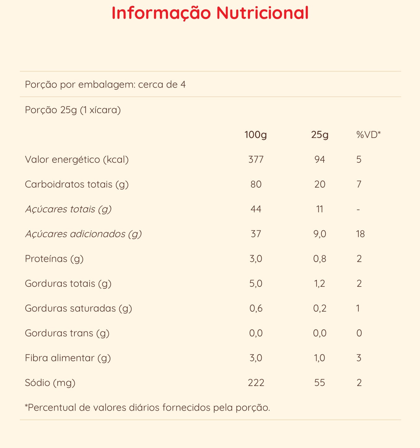 Ingredientes: Milho para pipoca, açúcar demerara, açúcar mascavo, glicose de milho, óleo de girassol, canela, bicarbonato de sódio, cremor tártaro, sal, emulsificantes lecitina de soja e aromatizante sintético idêntico ao natural.