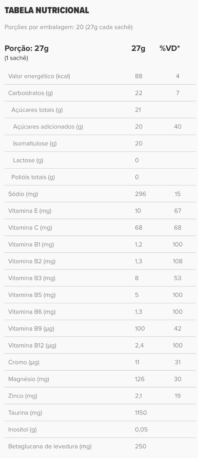 Ingredientes: Isomaltulose (Palatinose™), taurato de magnésio, abacaxi liofilizado, cloreto de sódio, citrato de sódio, betaglucana de levedura (Saccharomyces cerevisiae), hortelã em pó, cloreto de potássio, gengibre em pó, goma acácia, inositol (mio-inositol), ácido ascórbico revestido, palmitato de ascorbila, acetato de tocoferol, bisglicinato de zinco, nicotinamida, pantotenato de cálcio, ácido nicotínico, cloridrato de tiamina, riboflavina-5- fosfato, piridoxal-5-fosfato, L-metilfolato de cálcio, picolinato de cromo, metilcobalamina, aromas naturais de abacaxi e limão e aromas naturais extratos de chá verde e pimenta-vermelha (Capsicum annuum L.), antiumectantes dióxido de silício e fosfato tricálcico, antioxidante ácido cítrico, espessante goma xantana, edulcorante glicosídeos de esteviol (estévia).