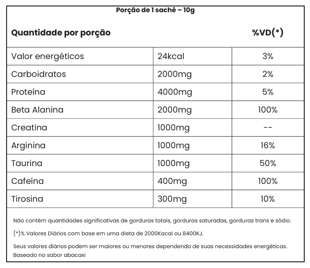 Ingredientes: Maltodextrina, beta alanina, creatina, arginina, taurina, cafeína, tirosina, ácido cítrico, fosfato tricalcico, aroma idêntico ao natural de abacaxi, aroma de mascarante, edulcorante sucralose, corantes amarelo 5.