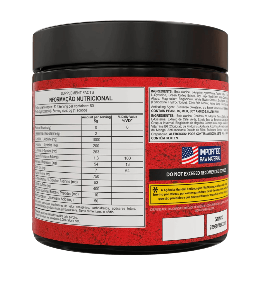 Ingredientes: Beta Alanina, L-Arginina, Taurina , Colostro Bovino em Pó, Cafeína, Cisteína, L-Tirosina, N-Acetil L-Metionina, Ácido Ascórbico, Extrato de café verde, Extrato seco de semente de uva, Alga Chondrus Crispus Invernal, Bisglicinato de Magnésio, Zindo Aspartato, Vitamina B6 (Cloridrato de Piridoxina), Aroma Idêntico ao Natural de Frutas Vermelhas, Corante Vermelho de Beterraba, Acidulante ácido Cítrico, Edulcorante Sucralose.