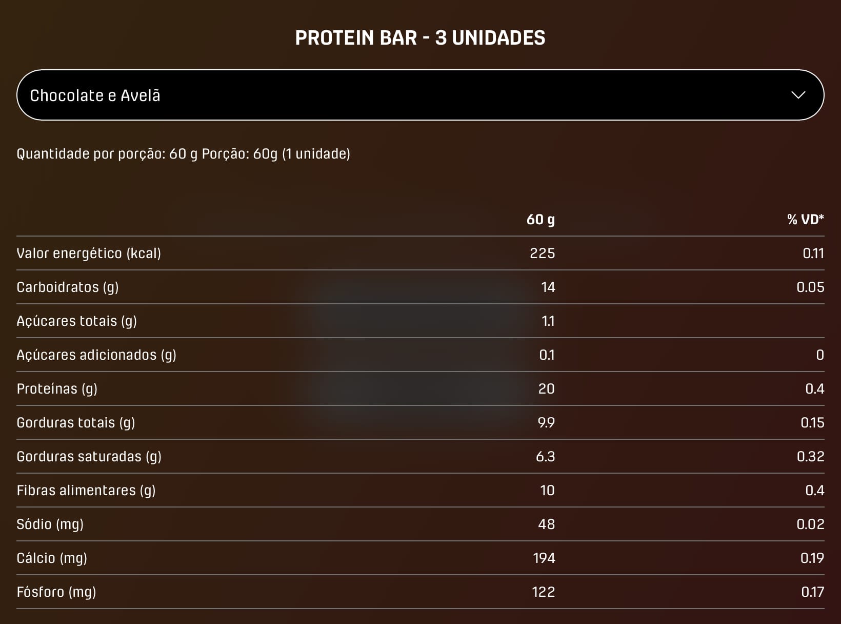 Ingredientes: Blend de proteínas (proteína concentrada de leite, caseinato de cálcio e proteína de soro do leite isolada), cobertura sabor chocolate, xarope de tapioca, recheio sabor chocolate, colágeno hidrolisado, gordura de palma, frutooligossacarídeos (FOS), cacau em pó, umectante, antioxidante, aromatizante, conservante e edulcorante.