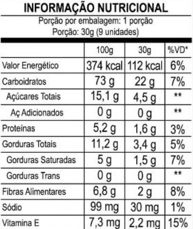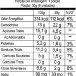 Ingredientes: Farinha de arroz integral, farinha de mandioca, edulcorantes maltitol e glicosídeos esteviol, gordura de palma, flocos de arroz, ameixa desidratada, mandioca desidratada, suco desidratado de morango, polidextrose, fibra de celulose, farinha de arroz refinada, aroma idêntico ao natural de morango, fermentos químicos bicarbonato de amônio e bicarbonato de sódio, emulsificantes lecitina de girassol, goma xantana e vitamina E.