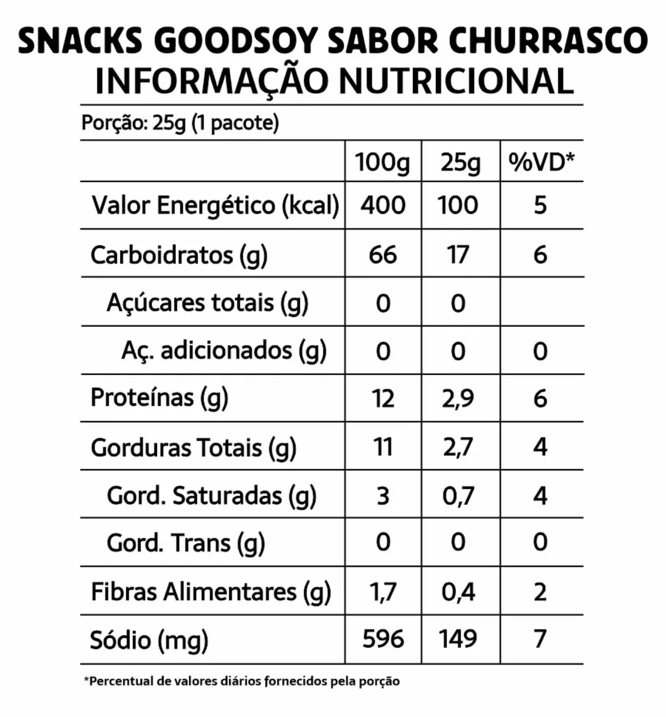 Ingredientes: Farinha de arroz, farinha integral de soja não transgênica, óleo vegetal (palma e soja), aromatizante e corante natural urucum.