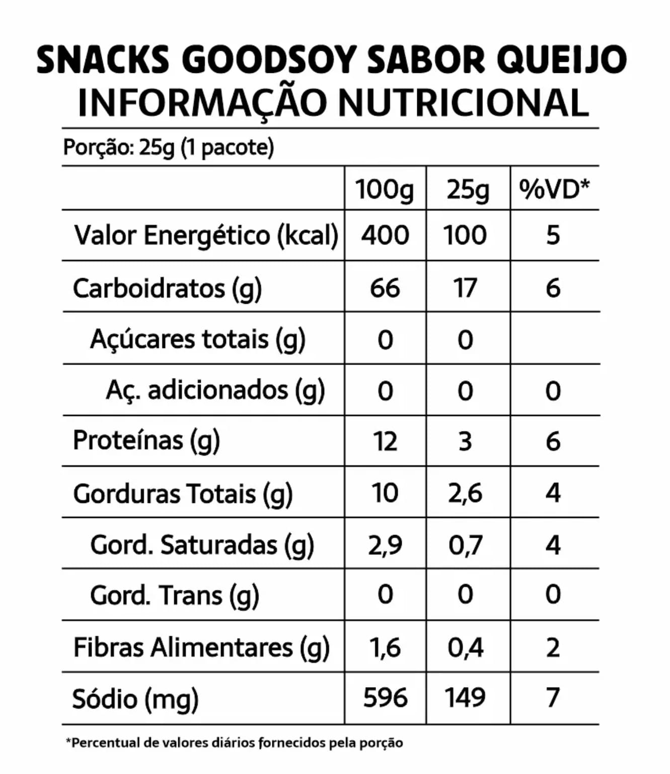 Ingredientes: Farinha de arroz, farinha integral de soja não transgênica, óleo vegetal (palma e soja), extrato de levedura, aromatizante e corante natural urucum.