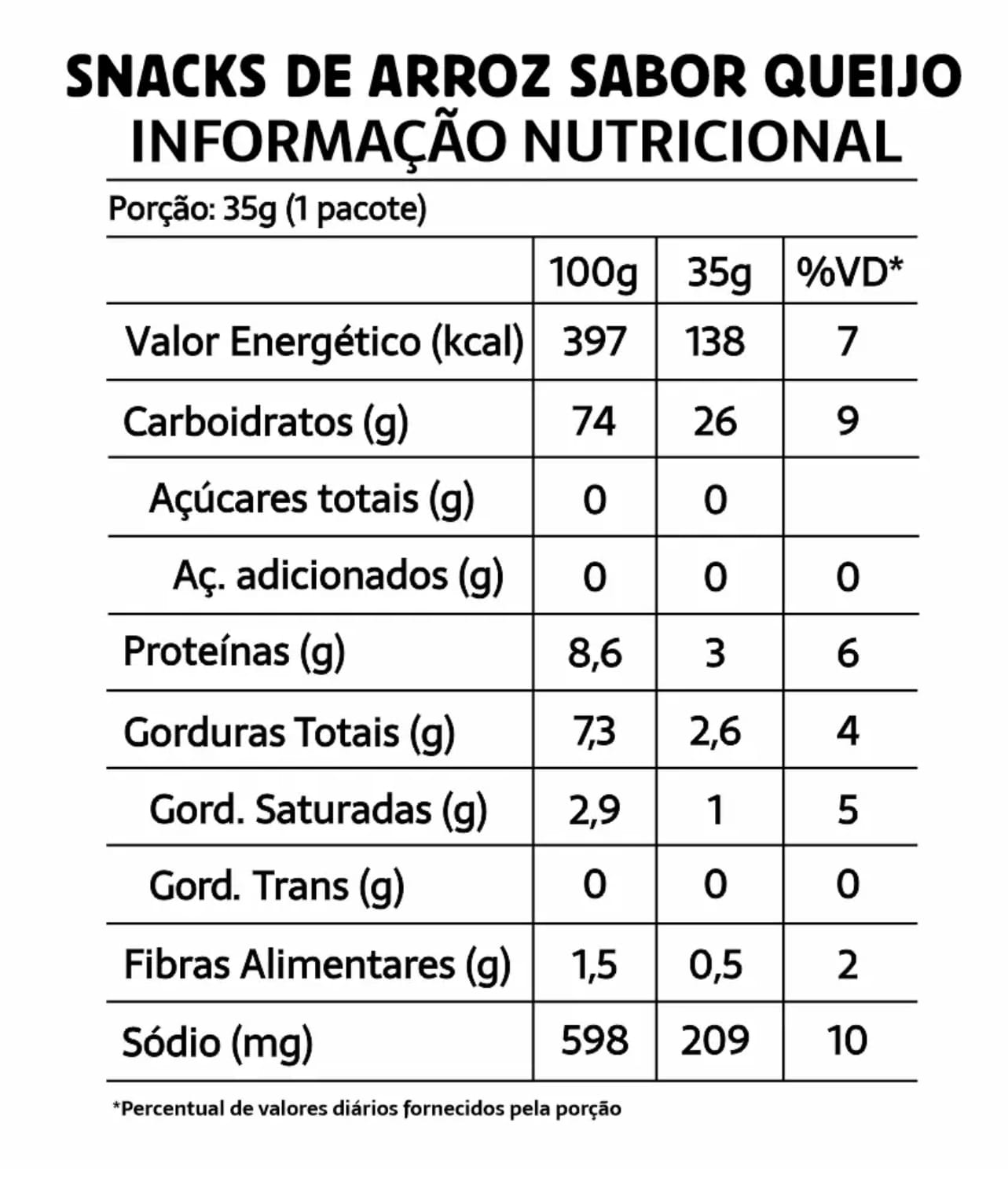 Ingredientes: Mix sem glúten (farinha de arroz, lentilha e quinoa), óleo vegetal (palma e soja), extrato de levedura, aromatizante e corante natural urucum.