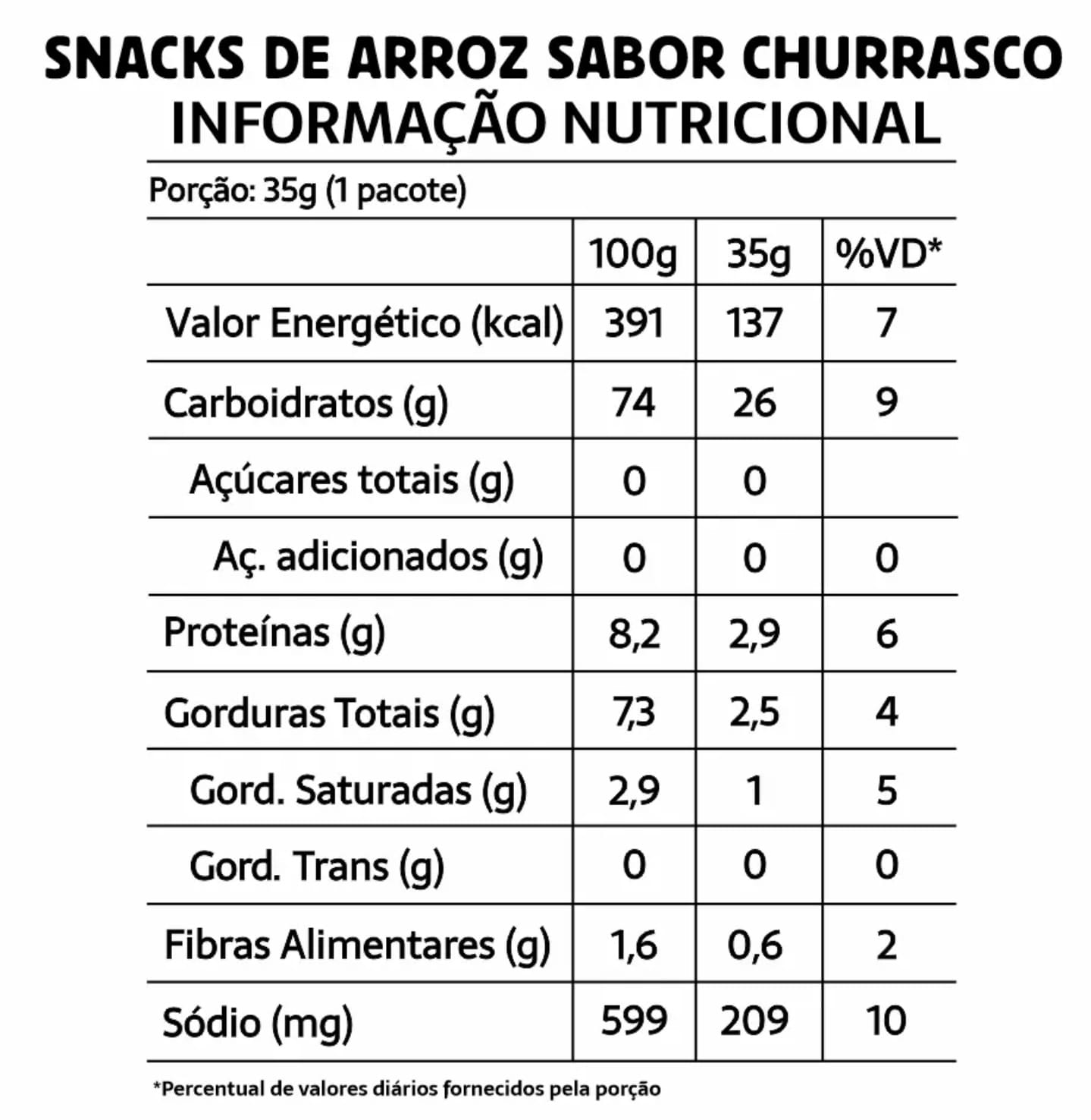 Salgadinho assado sem glúten, com Chia e Quinoa, sal light, zero gordura trans e sem ingredientes artificiais. Ele contém 1g de fibras que auxiliam no funcionamento intestinal e promove maior sensação de saciedade. Além de 1,9g de proteínas.