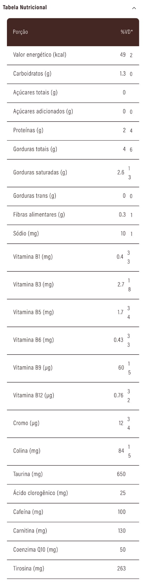 Ingredientes: Triglicerídeos de cadeia média C8 + C10 (TCM), colágeno hidrolisado, café arábica solúvel, taurina, L-tirosina, café verde moído, coenzima Q10, bitartarato de colina, cafeína microencapsulada, L-carnitina L-tartarato, especiarias, complexo de vitaminas B (tiamina mononitrato (vitamina B1), nicotinamida (vitamina B3), D-pantotenato de cálcio (vitamina B5), cloridrato de piridoxina (vitamina B6), ácido N-pteroil-L-glutâmico (vitamina B9), cianocobalamina (vitamina B12)), picolinato de cromo, aromatizantes, regulador de acidez bicarbonato de sódio e edulcorante glicosídeos de esteviol de Stevia rebaudiana Bertoni.
