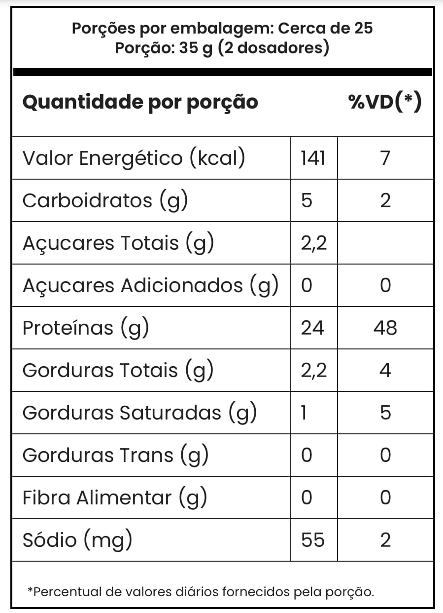 Ingredientes: Proteína de soro do leite concentrada (WPC), Proteína de soro do leite isolada (WPI), Proteína de soro de leite hidrolisada (WPH), cacau em pó, pedaços de chocolate maltado, aroma idêntico ao natural de chocolate maltado, cloreto de potássio, estabilizante goma xantana, edulcorantes sucralose e acessulfame de potássio.