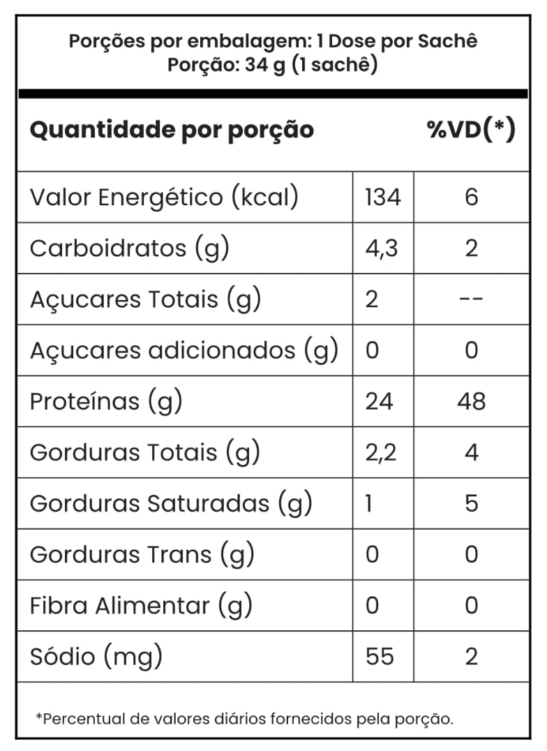 Ingredientes: Proteína de soro do leite concentrada (WPC), Proteína de soro do leite isolada (WPI), Proteína de soro de leite hidrolisada (WPH), aroma idêntico ao natural de banana com doce de leite, cloreto de potássio, estabilizante goma xantana, edulcorantes sucralose e acessulfame de potássio.