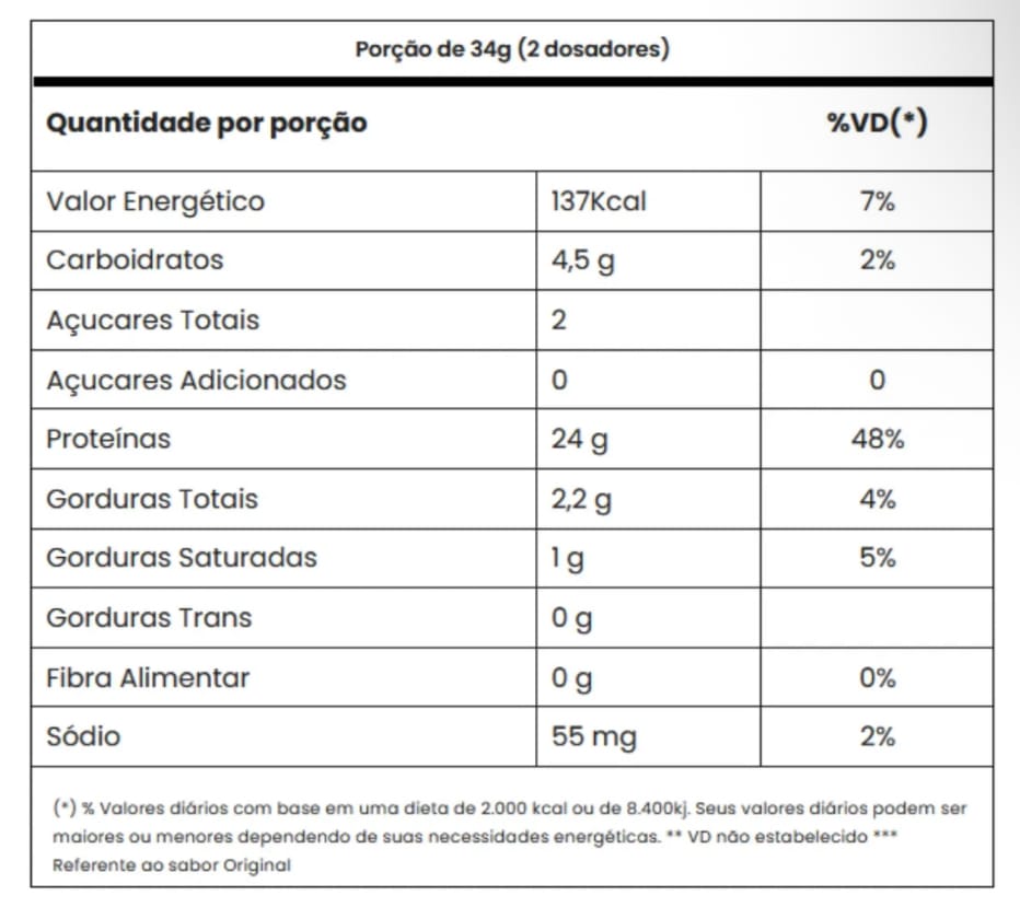 Ingredientes: Proteína de soro do leite concentrada (WPC), Proteína de soro do leite isolada (WPI), Proteína de soro de leite hidrolisada (WPH), aroma idêntico ao natural de beijinho, cloreto de potássio, estabilizante goma xantana, edulcorantes sucralose e acessulfame de potássio.