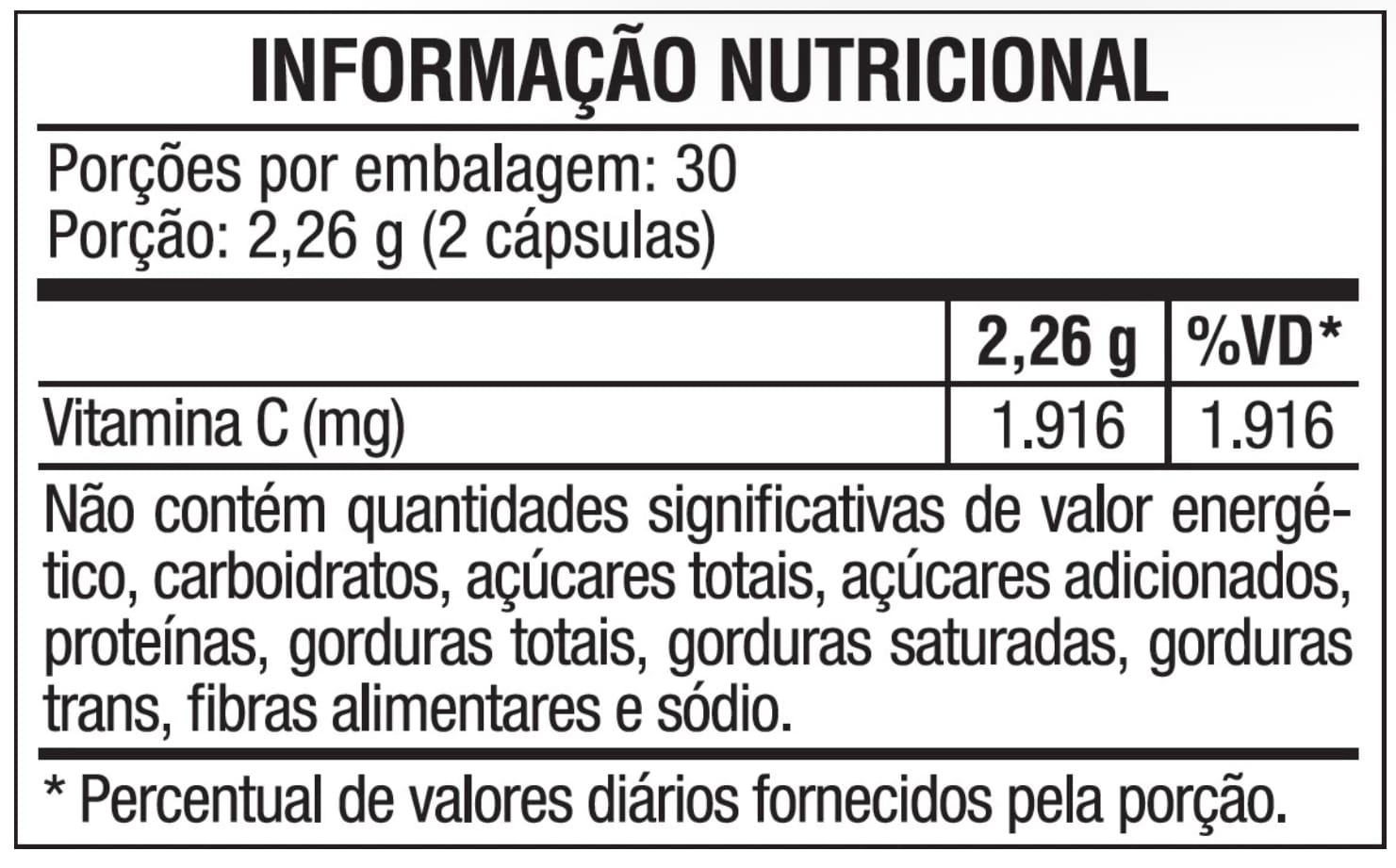 Ingredientes: Ácido ascórbico, ascorbato de sódio, palmitato de ascorbila e antiumectante estearato de magnésio. Cápsula: água purificada, amido modificado, estabilizante hidroxipropilmetilcelulose (HPMC), corante carbonato de cálcio, gelificante carragena e regulador de acidez acetato de potássio.