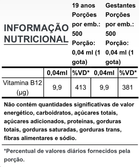 Ingredientes: Água, metilcobalamina (vitamina B12), agente de massa glicerina, antioxidante ácido crítico e aroma natural de amora, cereja e framboesa.