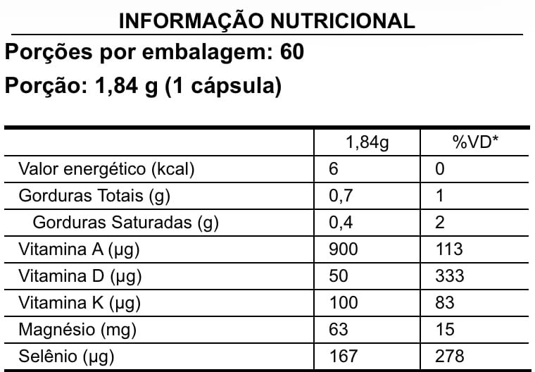 Ingredientes: Bisglicinato de magnésio, óleo de coco, cápsula (gelatina, água purificada, umectante glicerol e corante sais de potássio e sódio de clorofilina cúprica), óleo de girassol, palmitato de retinol (vitamina A), selenito de sódio, menaquinona-7 (vitamina K2), colecalciferol (vitamina D) e emulsificante lecitina.