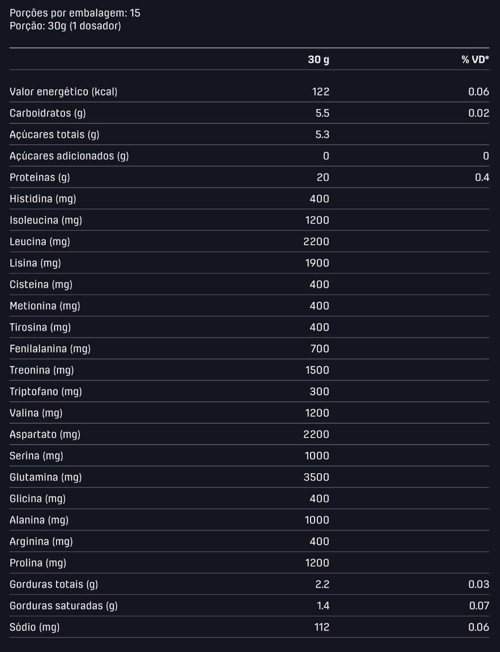 Ingredientes: Proteína de soro do leite concentrada, aromatizantes e edulcorantes sucralose e acesulfame de potássio.